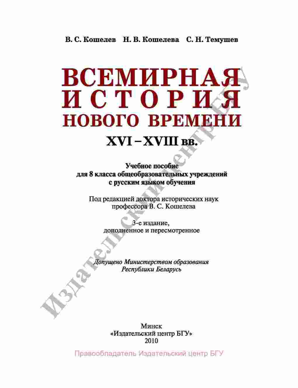 Учебник "Всемирная История Нового времени XVI-XVIII века" для 8 класса, созданный авторами Кошелевым и Темушевым, представляет собой исследование периода Нового времени, когда происходили важные события и перемены в мировой истории. В этой книге вы найдете подробные рассказы о ключевых событиях этого периода, включая Великую реформацию, эпоху Возрождения и Великую географическую открытую. Авторы анализируют влияние этих событий на политику, культуру и общество мировых держав. Книга также включает в себя исторические карты и иллюстрации, чтобы визуализировать прошлое. Этот учебник поможет студентам понять важность этого периода в мировой истории, развить аналитические исторические навыки и успешно подготовиться к школьным проверкам.
